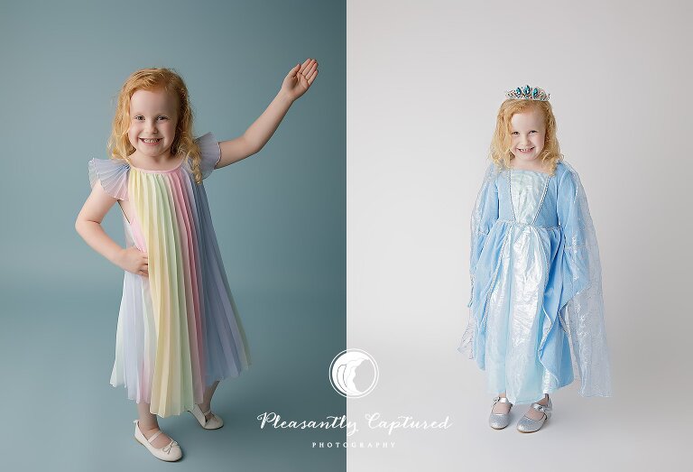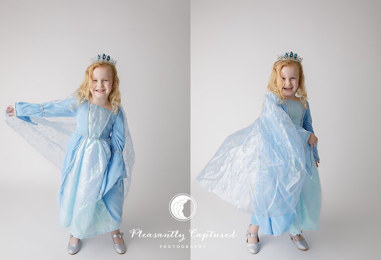 Next came the costume she couldn’t wait to wear: her Elsa dress. As soon as she put it on, she lit up — and suddenly we were in Arendelle. She danced, tossed invisible snowflakes, and fully embraced her inner queen. These are the moments I love capturing most during milestone sessions — the little details that show exactly who your child is at this point in time.